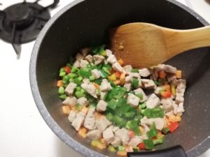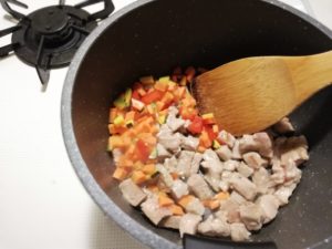 鍋に少量の油(今回は、白ゴマ油を使用)を入れて肉・人参を炒める。