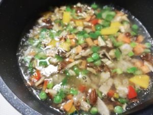 油がまわったら、【野菜類】を全部入れて軽く炒めたら、水400cc(今回は、しじみスープストック)を加えて煮る。