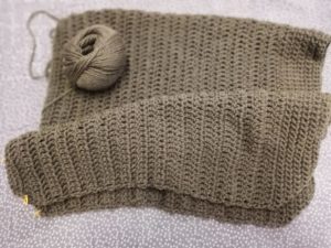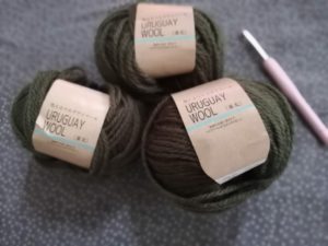 今まで、白黒モノトーン以外のカラーを選ぶ事がなかったけれど、初めてモノトーンではない「モスグリーン」の毛糸で編んでみました。