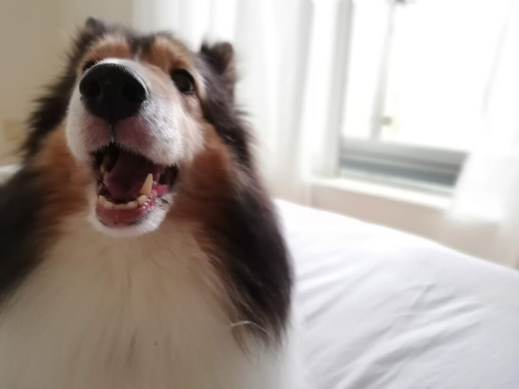 寝ぼけたように目を開けて、ハッと我に返ってとりあえずワンワンと言ってみるキナリさん。