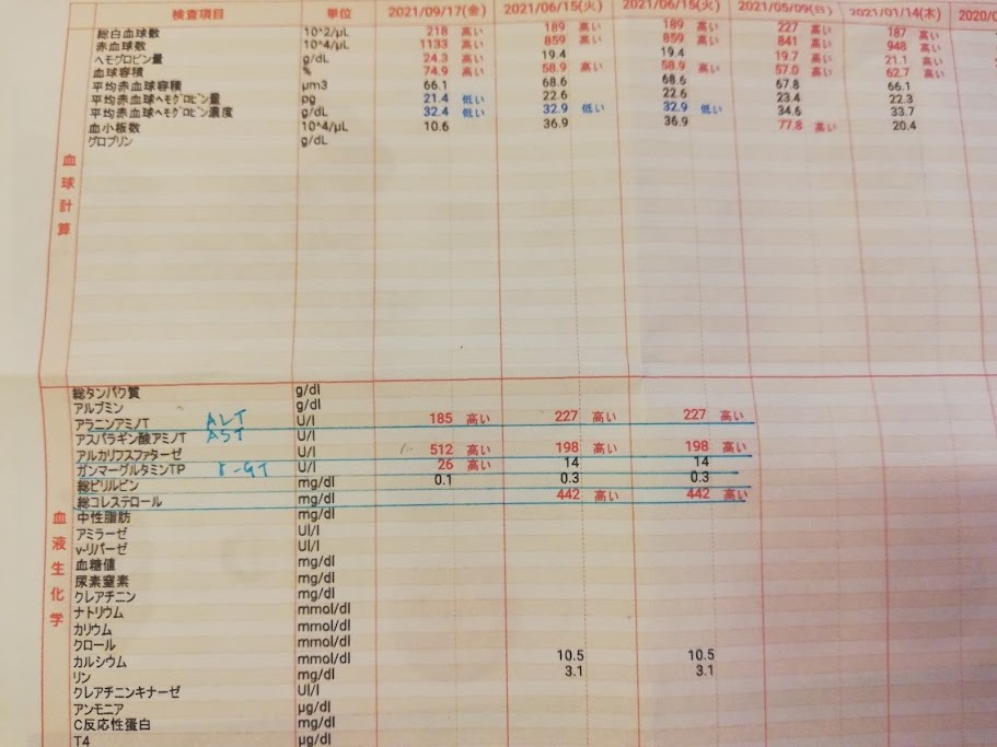 腹部の超音波検査でも言われたけれど、この数値が上がっていることからやはり「胆汁うっ滞」ということも考えられそうです。