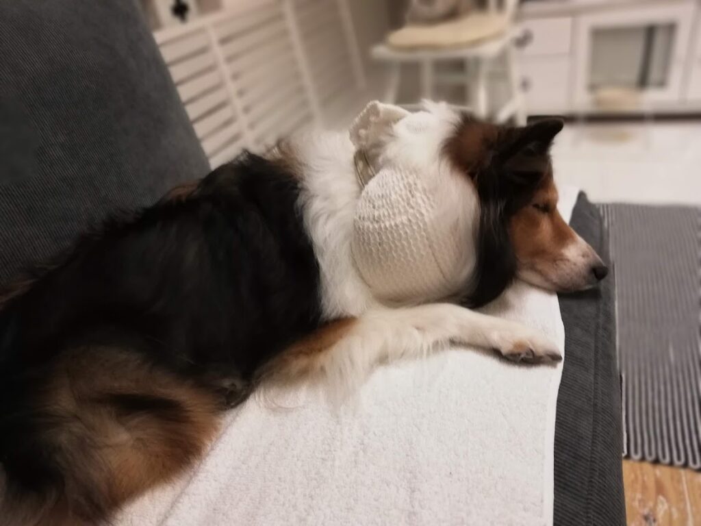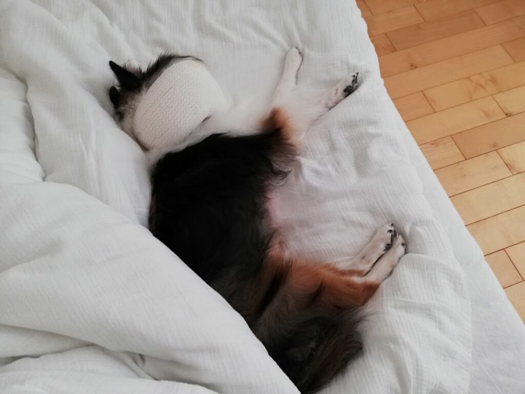 動物病院で着けてもらうプラスチックのモノより、クッションのようになっている方が着けたまま眠れるしストレスがなさそう。